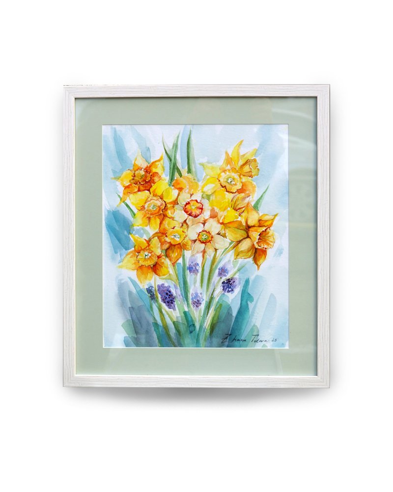 Ръчно нарисувана акварелна картина на нарциси със сива паспарту и бяла рамка.